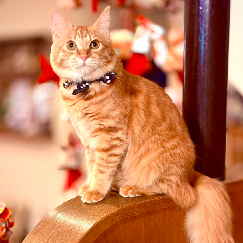 2025年にやってきたみみたんは、ふわふわの長毛と優雅に揺れるもふもふの尻尾が自慢のチャトラ柄の猫。人懐っこくておしゃま、食いしん坊で好奇心旺盛なおてんば娘です。茶トラの女の子。普段は6匹の仲間たちと元気いっぱいに走り回っていますが、姉妹猫のキナコと寄り添ってかわいらしく眠る姿は、まるで天使のようなかわいらしさ。会えばきっと、その愛らしさに魅了される看板猫です。